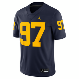 Celebrate Aidan Hutchinson’s Michigan legacy with the Wolverines Jordan Brand Alumni Game Jersey. Built with lightweight recycled polyester and mesh paneling, this jersey is designed for all-day comfort whether you’re in the stands or repping your team around town. Heat-sealed details and an authentic game-day look make it a must-have for any true Michigan fan.